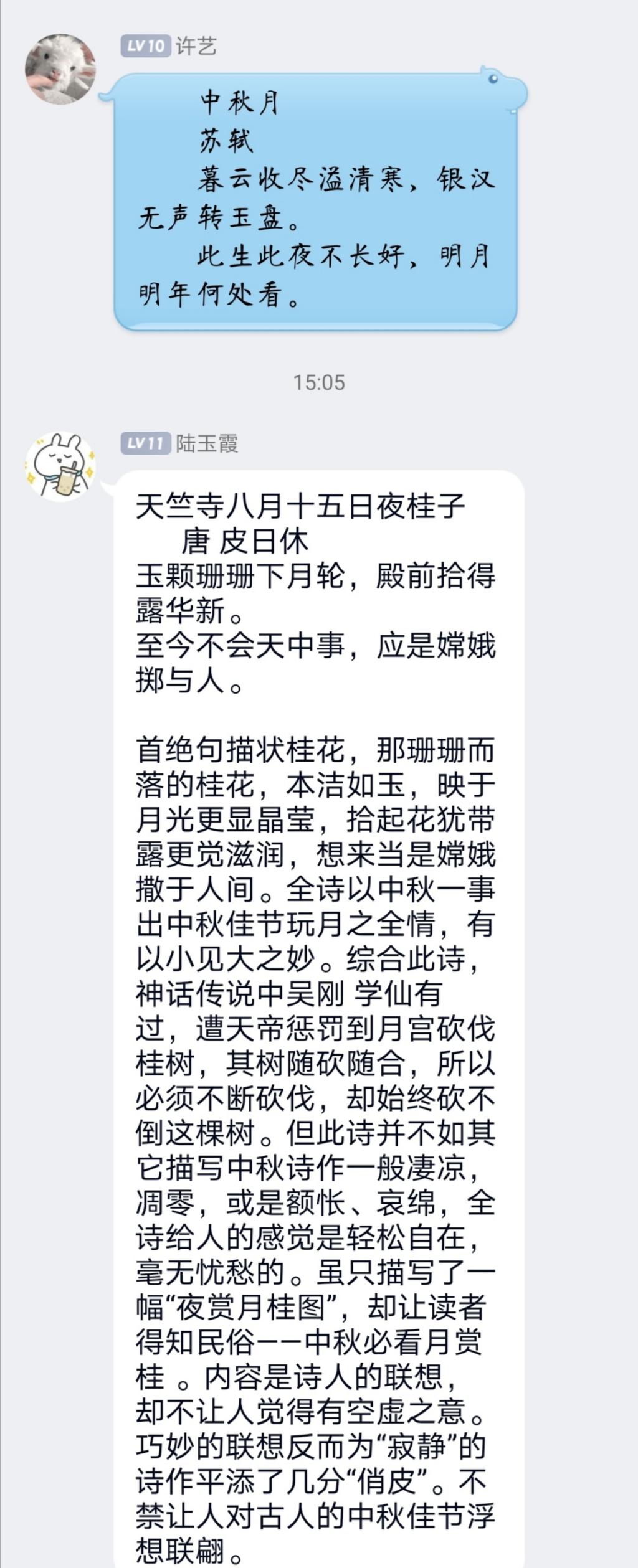 首先是2017级-2019级各团支部各自召开了丰富多彩的线上线下主题团日活动。各团支部通过了解中秋节的由来、分享中秋节的故事、畅谈中秋节的习俗、探讨中秋节的诗词及其寓意,使团员们不仅了解到了更多的中秋节知识、习俗,还对中国这一传统佳节及传统文化有了更深层次的了解和热爱,使中华传统文化得到更好的传承。