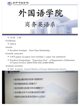 工业大学就读的博士研究生和两名来自于20级商务英语专业的优秀学子,分别围绕“考研经验”、“大学学习”和“老员工活”,向同学们分享了自己的宝贵经验,并对新生提出的问题