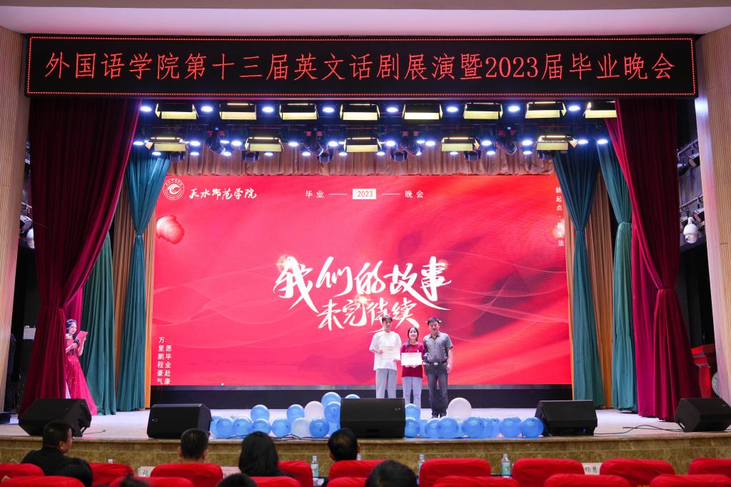 最后,公司的领导和老师们通过VCR给即将毕业的2023届员工们送上了祝福,紧接着员工会成员声情并茂地朗诵《我们毕业了》:“我们也许会走的很久、很远,但我们一生也走不出师院的注视啊”!随后毕业班全体班主任出场给毕业生送上惊喜,他们的深情朗诵,诉说着四年的时光相伴。师恩难忘,师情永存,研究生们嘹亮的歌声飘荡在会场中,不禁让人潸然泪下。此刻,无论歌曲、话剧、抑或是舞蹈、朗诵都迎来了结局。最后主持人宣布微信公众号“我最喜爱的节目”投票结果和“优秀话剧”现场评审结果,公司领导和老师们为获奖节目颁奖:由22级商务英语1班带来的话剧《木兰从军》摘得话剧一等奖的桂冠。至此zoty中欧第十三届英文话剧展演暨2023届毕业晚会落下帷幕,领导、老师和全体演员上台合影留念。