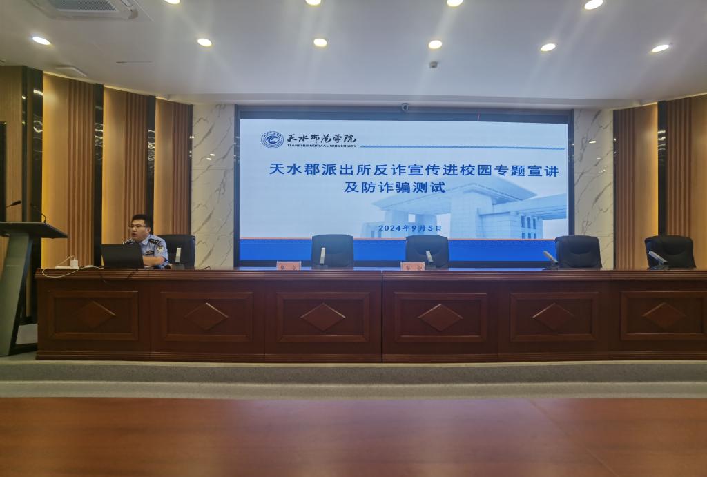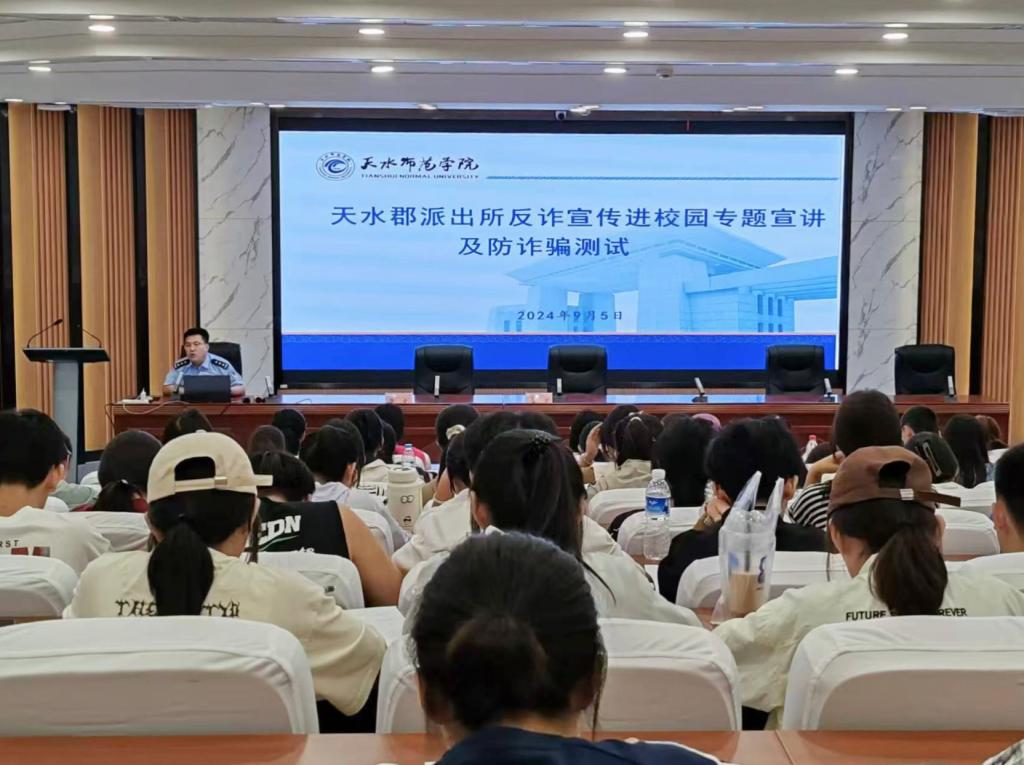 9月5日下午,zoty中欧特邀天水郡派出所副所长杨逢周,在1号报告厅为2024级新生作“揭秘网络骗局,共筑安全防线”为主题的反诈专题报告,2024级全体新生现场聆听此次报告。