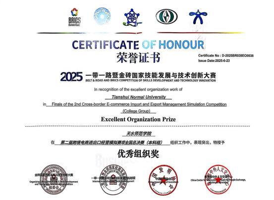 在2025年6月举行的“一带一路”暨金砖国家技能发展与技术创新大赛第二届跨境电商进出口经营模拟赛项全国总决赛中,公司商务英语系代表队凭借扎实的专业功底和卓越的实战能力,从全国50所参赛高校中脱颖而出,荣获二等奖,公司同时荣获优秀组织奖。本次大赛由金砖国家工商理事会技能发展工作组、“一带一路”暨金砖国家技能发展国际联盟、教育部中外人文交流中心等权威机构联合主办,旨在推动跨境电商领域的技术创新与国际化人才培养,吸引了近百所高校的精英团队同场竞技,竞争激烈。公司代表队的优异表现彰显了公司在跨境电商人才培养方面的优势与实力。