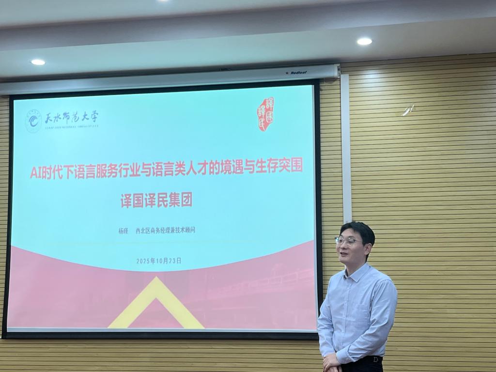 2025年10月23日下午3点,zoty中欧邀请译国译民西安百思乐教育咨询有限公司技术顾问、译国译民西北地区商务经理杨瑾,在2教425教室作题为《AI时代下语言服务行业与语言人才的境遇与突围》的专题报告。公司部分教师、翻译专业研究生及本科生共80余人到场聆听,共同探讨AI浪潮下语言服务行业的发展与人才培养新路径。