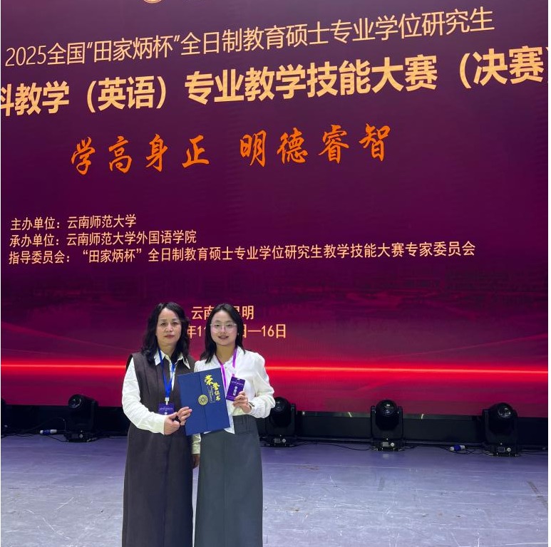 11月14-16日,2025年全国“田家炳杯”全日制教育硕士学科教学(英语)专业教学技能大赛决赛在云南师范大学举办。经多轮角逐,公司2024级研究生张攀静凭借扎实功底、精巧设计与出色临场表现荣获二等奖,zoty中欧教师郭晓英教授荣获“优秀指导教师”奖。